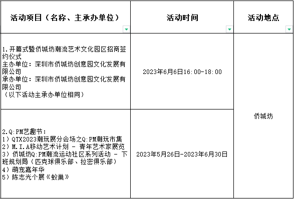 侨城坊项目坐落于南山侨城以北,是集国际生态特色建筑,地景式艺术街区商业、艺术酒店式公寓、商务办公、艺术展演空间、生态园林于一体的约35万平方米的大型现代化综合体。侨城坊深耕文化创意行业多年,致力打造潮流潮玩×都市生活方式的艺术潮玩创意园区,自2019年起侨城坊先后举办了多场国内外潮玩先锋艺术盛事;承接腾讯、爱奇艺、抖音等多档顶流潮玩综艺;创立主理品牌 Q:PM,打造集音乐、艺术、运动、宠物、亲子等为一体的艺术生活新领地;启动“M.I.A.移动艺术计划”打造移动艺术交流平台,为青年艺术家提供自主展示、孵化发展的机会。侨城坊将融合最新最潮的文化及科技内容,打造成潮流艺术界新兴集结地、成为具有深圳地标属性的国际化创新社区。