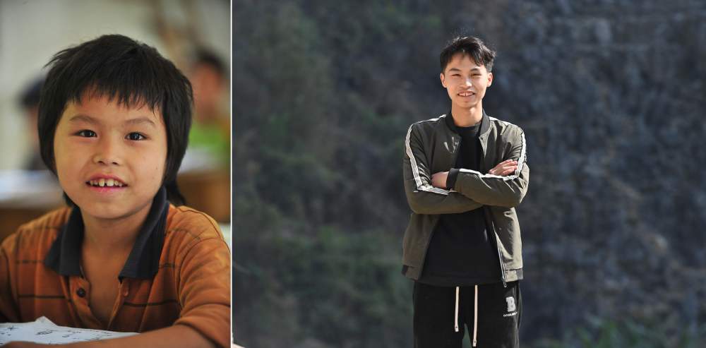 左图为2012年7月4日,在大化瑶族自治县板升乡弄勇小学,7岁的蒙锦晨在课堂上;右图为2023年1月25日,在大化瑶族自治县板升乡弄勇村,正在浙江省台州职业技术学院读大一的蒙锦晨寒假回家时在村中留影。