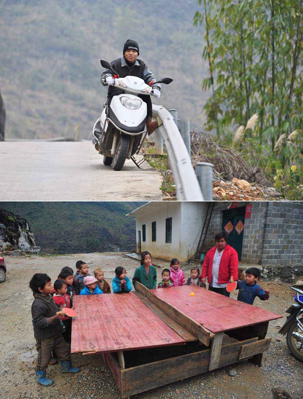 上图为2023年1月26日,在大化瑶族自治县板升乡弄勇村,在广东工作、返乡过年的蒙宣海在路边休息;下图为2012年12月27日,在弄勇村弄顶教学点,7岁的蒙宣海(右一)在打乒乓球。2022年,蒙宣海技校毕业后,选择去广东工作。