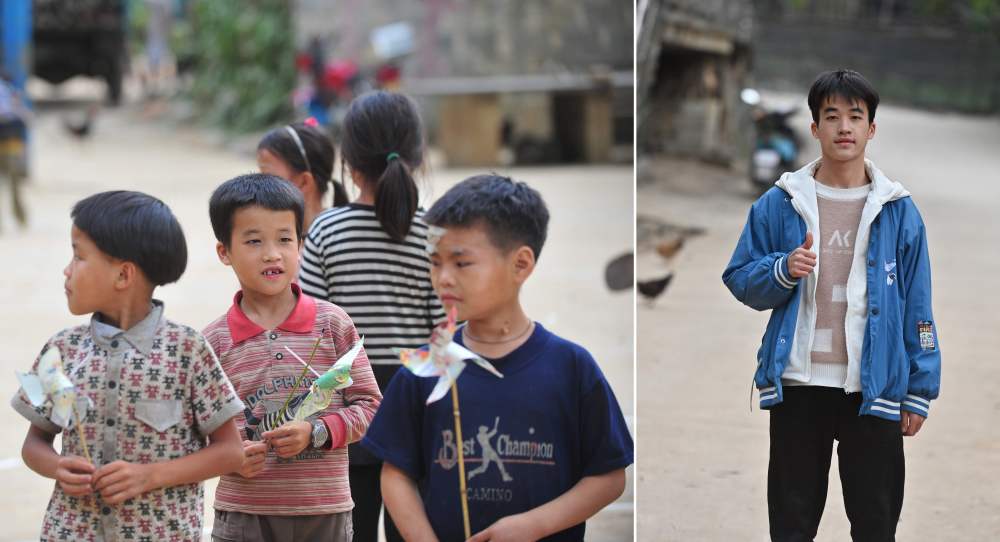左图为2012年7月4日,在大化瑶族自治县板升乡弄勇小学,7岁的蒙旺兵(左二)在校园里玩风车;右图为2023年1月25日,在大化瑶族自治县板升乡弄勇村,正在桂林理工大学读大一的蒙旺兵寒假回家时在村中留影。