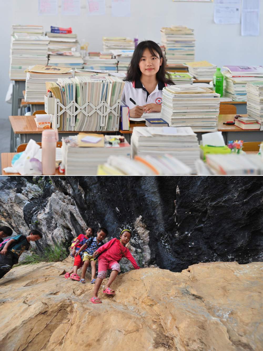 上图为2023年5月20日,蒙俐谷在大化瑶族自治县第二中学高二年级教室里学习(新华社记者胡星宇摄);下图为2012年9月3日,在大化瑶族自治县板升乡弄雷村,7岁的蒙俐谷(右一)爬悬崖去学校读书(新华社记者黄孝邦摄)。一年后将参加高考的蒙俐谷,希望能考上理想的大学。