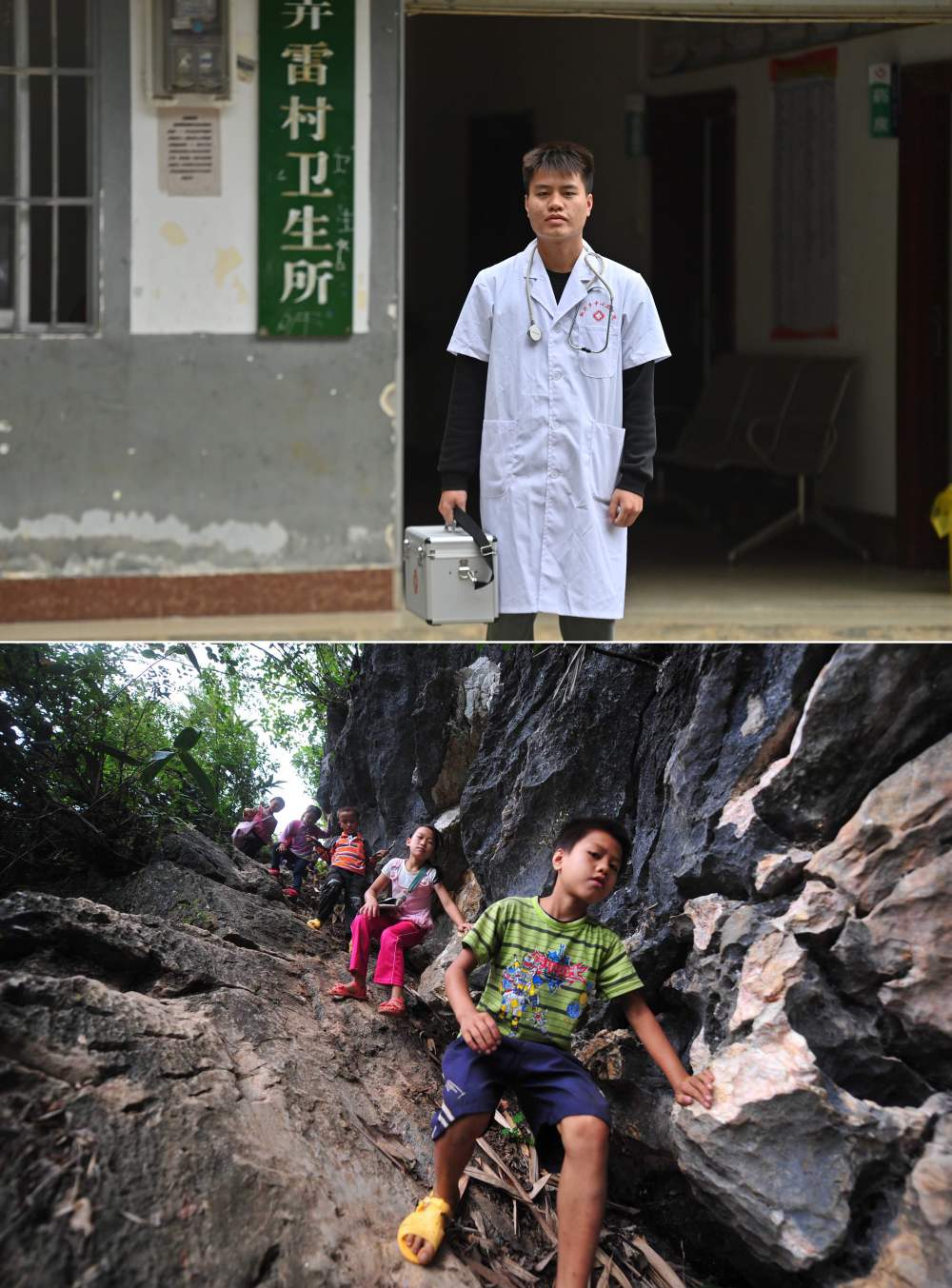 上图为2023年5月24日,村医蒙富松站在大化瑶族自治县板升乡弄雷村卫生所前(新华社记者胡星宇摄);下图为2012年9月5日,10岁的蒙富松(右一)爬悬崖去学校读书(新华社记者黄孝邦摄)。2021年,蒙富松从卫校毕业,回到家乡成为一名村医。