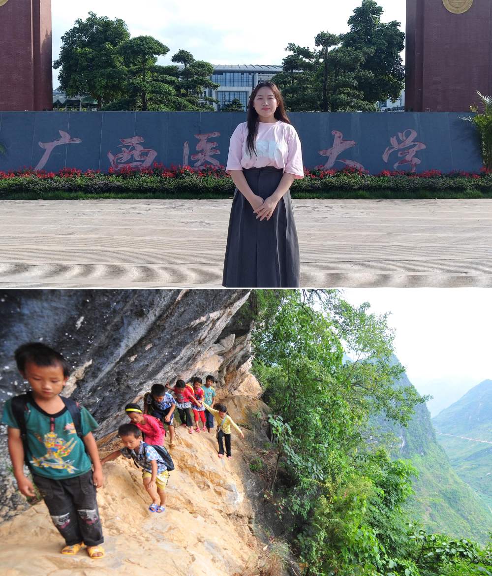 上图为2023年5月27日,22岁的蒙秋艳站在她就读的广西医科大学校门口(新华社发);下图为2012年9月3日,在大化瑶族自治县板升乡弄雷村哈保屯,11岁的蒙秋艳(右一)在悬崖边护着低年级的小伙伴回家(新华社记者黄孝邦摄)。2021年,蒙秋艳以优异的成绩,考取广西医科大学。