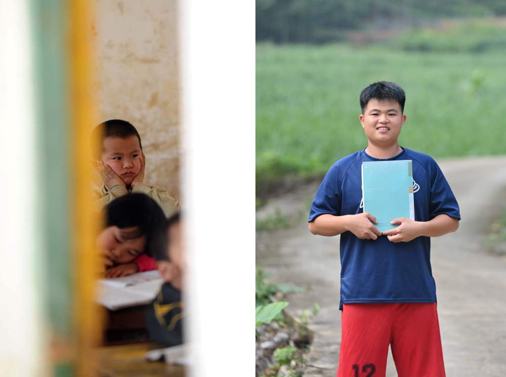 左图为2012年3月27日,在大化瑶族自治县大化镇仁良小学,6岁的韦康涛在教室里上课(新华社记者黄孝邦摄);右图为在大化瑶族自治县高级中学读高二的韦康涛(新华社记者胡星宇 2023年5月21日摄)。韦康涛的梦想是考上理想的大学。