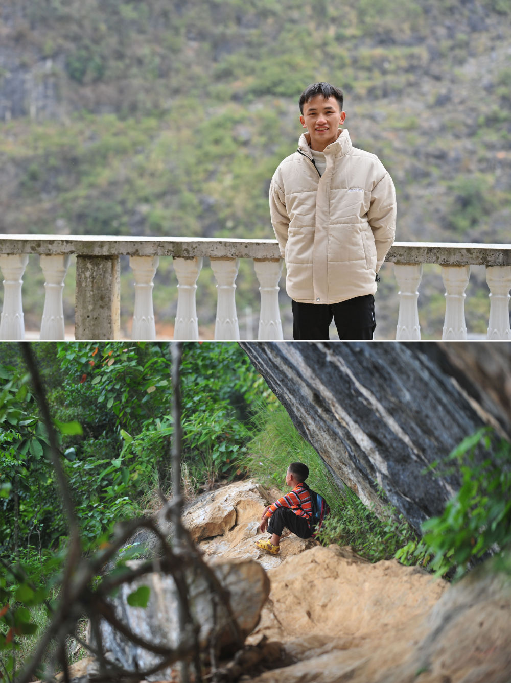 上图为2023年1月16日,在大化瑶族自治县板升乡弄雷村,即将从技校毕业的蒙科佑站在家门口;下图为2012年9月5日,在大化瑶族自治县板升乡弄雷村,10岁的蒙科佑在上学途中,坐在悬崖边上休息。21岁的蒙科佑,希望能挣钱供弟弟妹妹读书,让他们接受更好的教育。