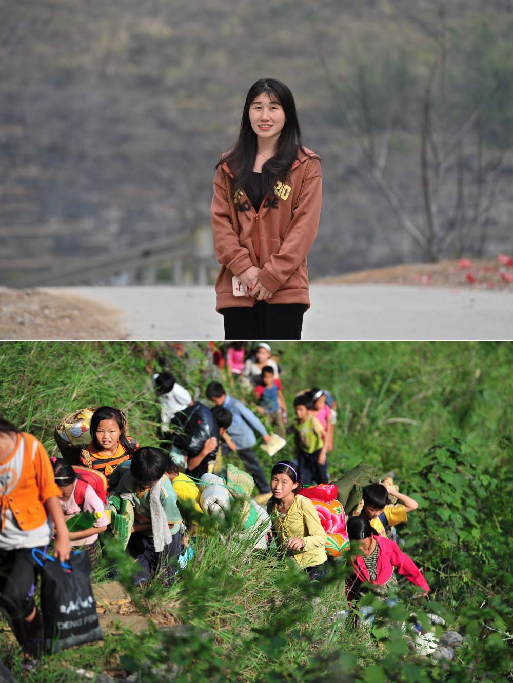 上图为2023年1月21日,在大化瑶族自治县板升乡弄勇村,大专毕业后在广州工作的蓝秋艳回家过年时在家门口留影;下图为2012年7月4日,学校放假后,11岁的蓝秋艳(着黄衣者)背着生活用具,走在回家的山路上。22岁的蓝秋艳正在努力考取教师资格证。