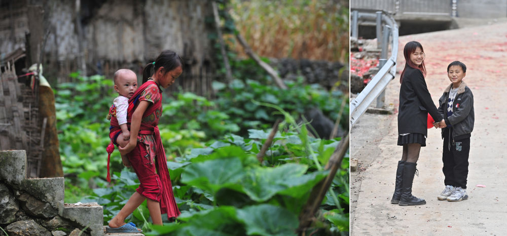 左图为2012年7月16日,在大化瑶族自治县板升乡弄勇村,10岁的蒙柔玉背着弟弟蒙宣朋去玩耍;右图为2023年1月20日,在大化瑶族自治县板升乡弄勇村,21岁的蒙柔玉(左)和12岁的弟弟蒙宣朋在一起。已经从幼师毕业的蒙柔玉,一边工作,一边学习舞蹈,为自己儿时的歌舞梦继续努力。