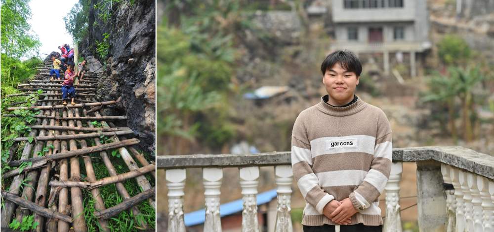 左图为2012年9月3日,在大化瑶族自治县板升乡弄勇村,7岁的蓝天德(右一)攀爬“天梯”去学校;右图为2023年1月23日,在大化瑶族自治县板升乡弄勇村,即将从技校毕业的蓝天德回家过年。18岁的蓝天德计划技校毕业后继续读大专。