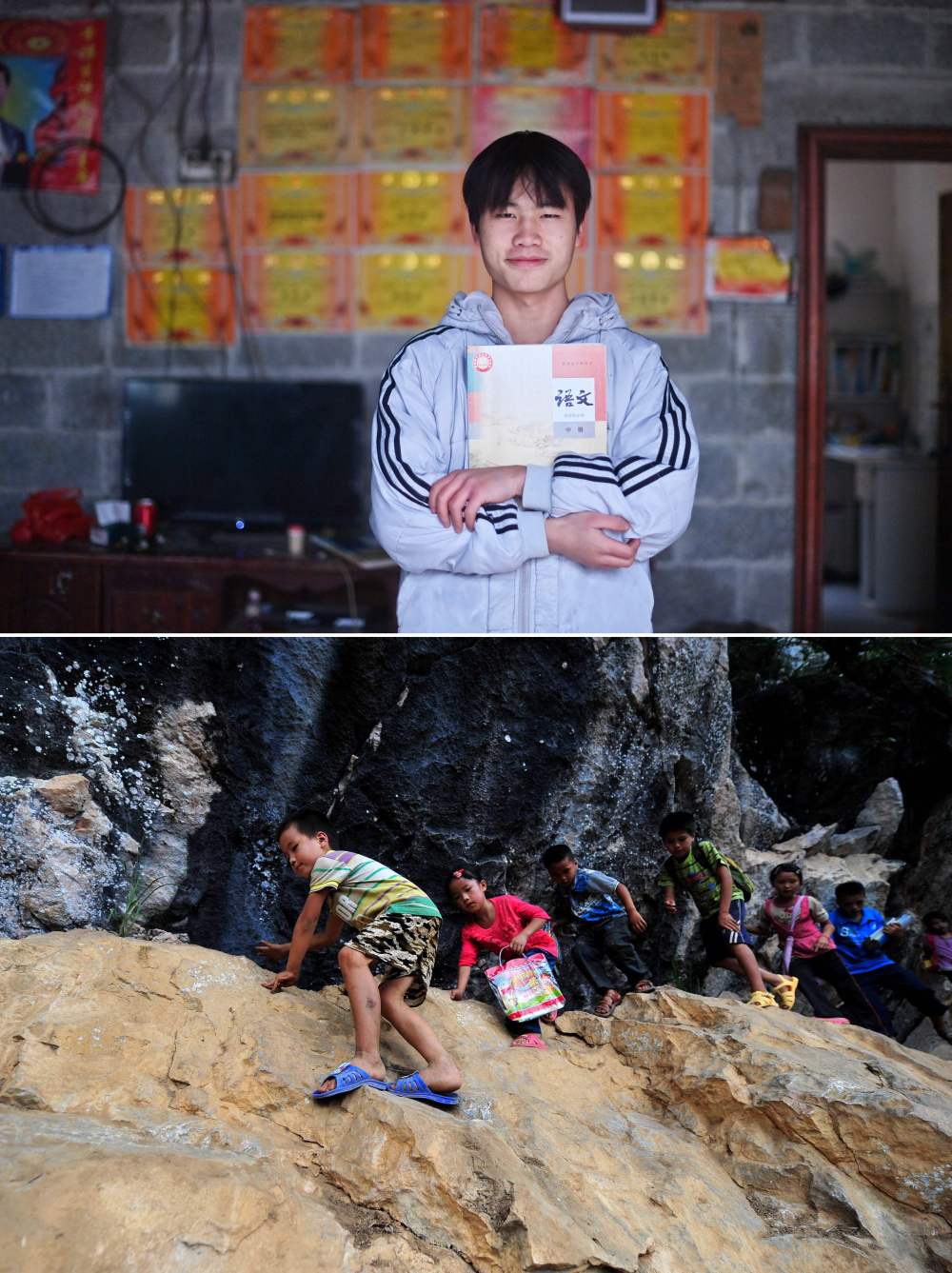 上图为2023年1月26日,在大化瑶族自治县板升乡弄雷村,大化瑶族自治县高级中学高二学生蒙文超站在家里,身后的墙上贴满奖状;下图为2012年9月5日,在大化瑶族自治县板升乡弄雷村,7岁的蒙文超(左一)放学后爬悬崖回家。今年18岁的蒙文超最大的梦想是一年后考上理想的大学。