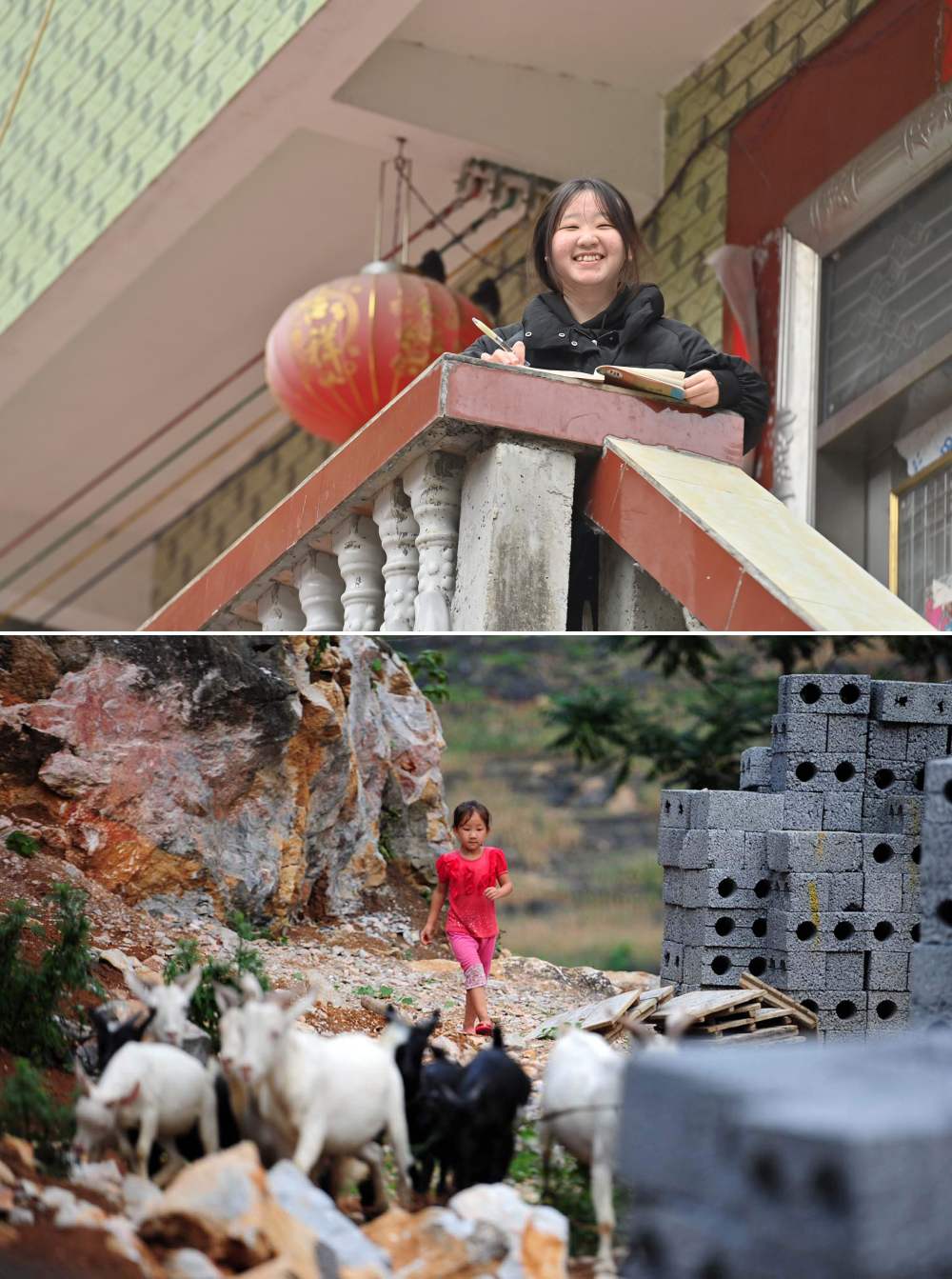 上图为2023年1月16日,在大化瑶族自治县板升乡弄勇村,正在读初中的蓝秀雪在家门口学习;下图为2013年7月14日,5岁的蓝秀雪在放羊。16岁的蓝秀雪即将参加中考,希望能考上一所好高中。