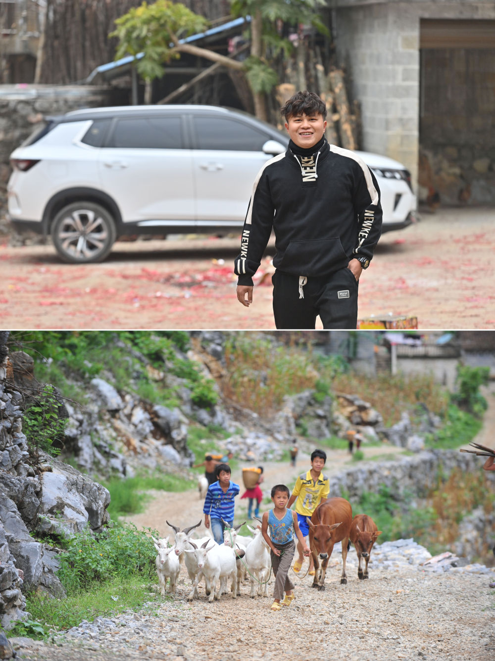上图为2023年1月21日,在大化瑶族自治县板升乡弄勇村,22岁的蒙宣朝站在自己刚刚购买的汽车前;下图为2012年7月16日,在大化瑶族自治县板升乡弄勇村,11岁的蒙宣朝(前)利用暑假帮家里放牧。技校毕业后,蒙宣朝到广东工作。