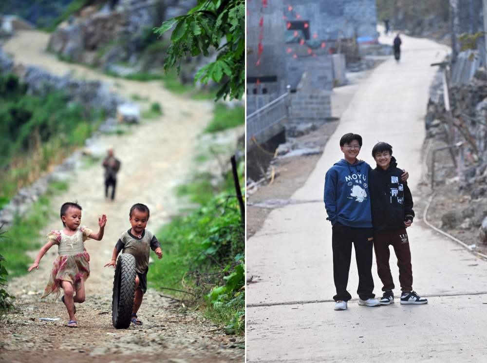 左图为2012年7月16日,在大化瑶族自治县板升乡弄勇村,4岁的蒙宣宏(左)穿着姐姐的旧衣服和同为4岁的蓝小帅在一起玩耍;右图为2023年1月21日,在大化瑶族自治县板升乡弄勇村,蒙宣宏(左)和蓝小帅合影。蒙宣宏和蓝小帅目前分别在板升乡和大化县城读初二。