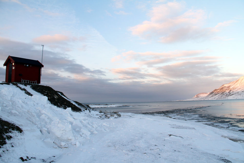 这是2018年2月24日在距离北极点一千多公里的挪威斯瓦尔巴群岛首府朗伊尔城拍摄的峡湾景色。新华社记者梁有昶摄