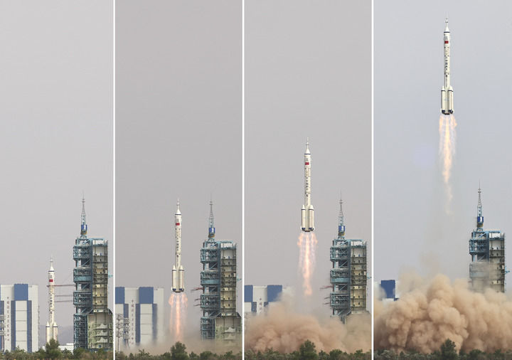 ↑这是神舟十六号载人飞船点火发射(合成照片)。 新华社记者 连振 摄