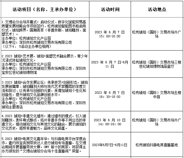 松岗琥珀(国际)交易市场于2016年7月28日正式开业,形成了以“一带两廊、三坊四区、产业配套”的产业链功能定位,集琥珀原料、成品交易、加工制造、精品展示、文化交流及主题生活于一体的琥珀产业综合基地。自开业至今,分别举办了以下大型活动:宝安区产业发展博览会松岗分会场、宝安区购物节活动、松岗科协科普日活动、琥珀大讲堂、琥珀品鉴会、琥珀精品展等活动。