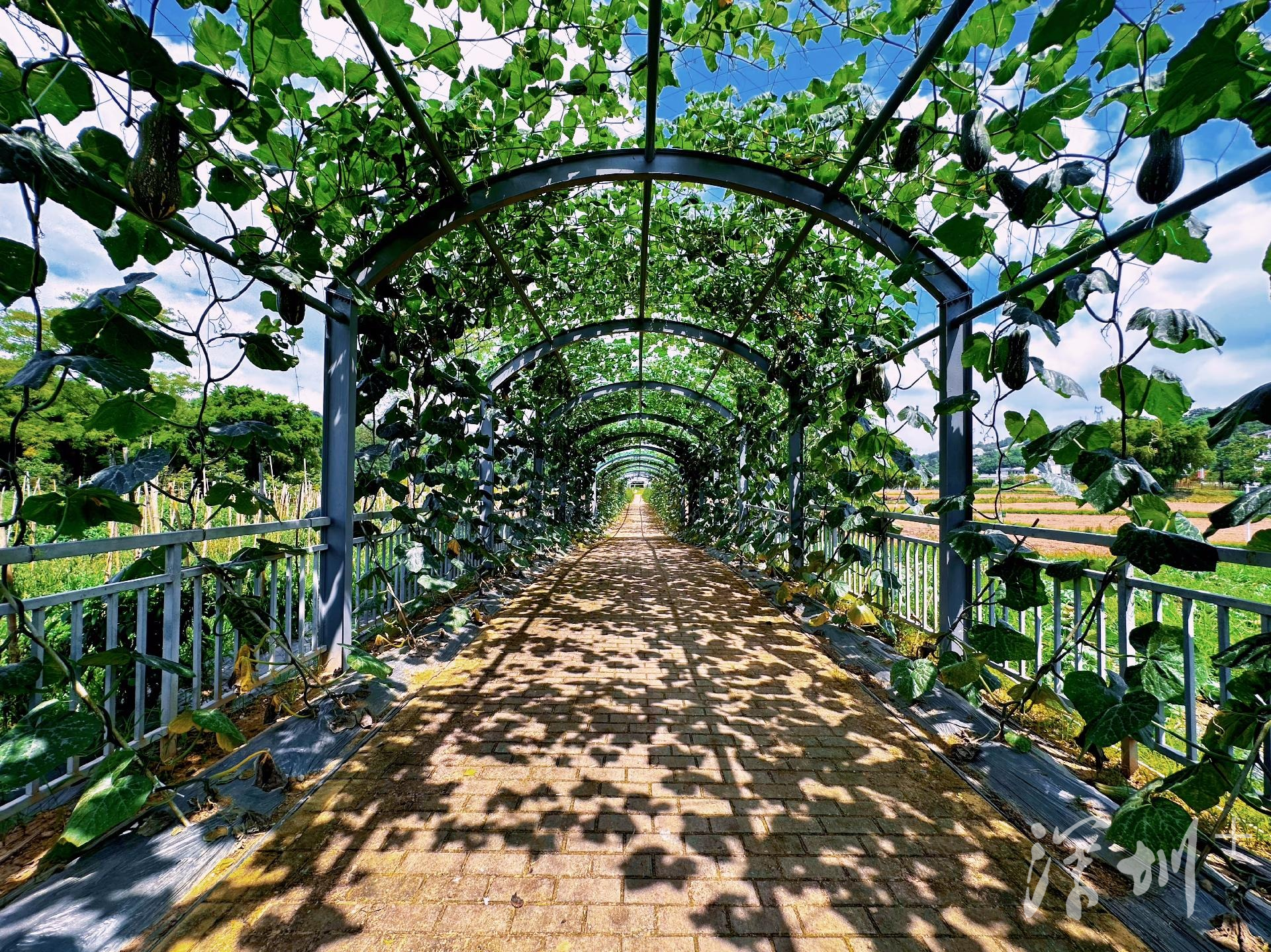 朝小镇深处走去,数千亩室外和室内蔬菜种植区错落有致地分布,灯笼南瓜、葫芦、空心菜、青瓜、百香果……满眼都是生机勃勃的翠绿,让入园的游客忍不住用一次次快门,与万物生长的喜悦,与美好生活的欢声共鸣。