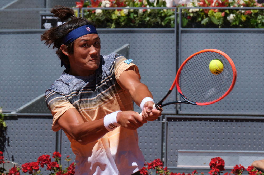 5月4日,张之臻在2023年马德里网球公开赛男子单打四分之一决赛中回球。新华社记者 孟鼎博 摄