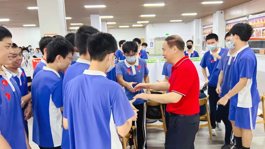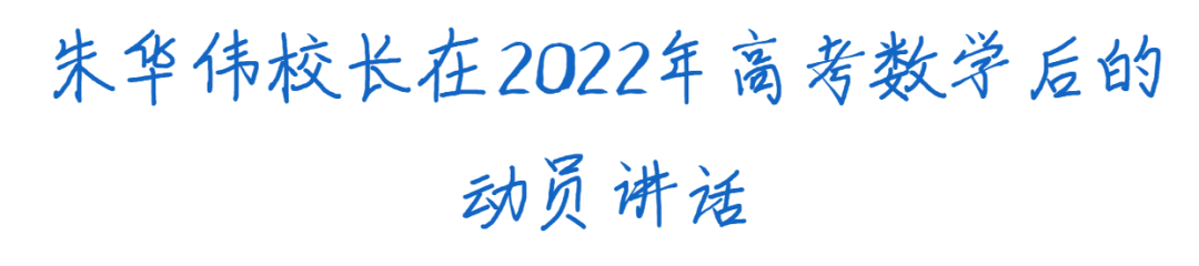 2022年6月8日上午7点45分,朱华伟校长到老校区备考室送考,依次问候17个班级的考生。当看到很多学生依然受前一天数学考试的影响而情绪低沉时,朱校长当即决定利用进考场前的十分钟,向全体高三学生发表动员讲话。