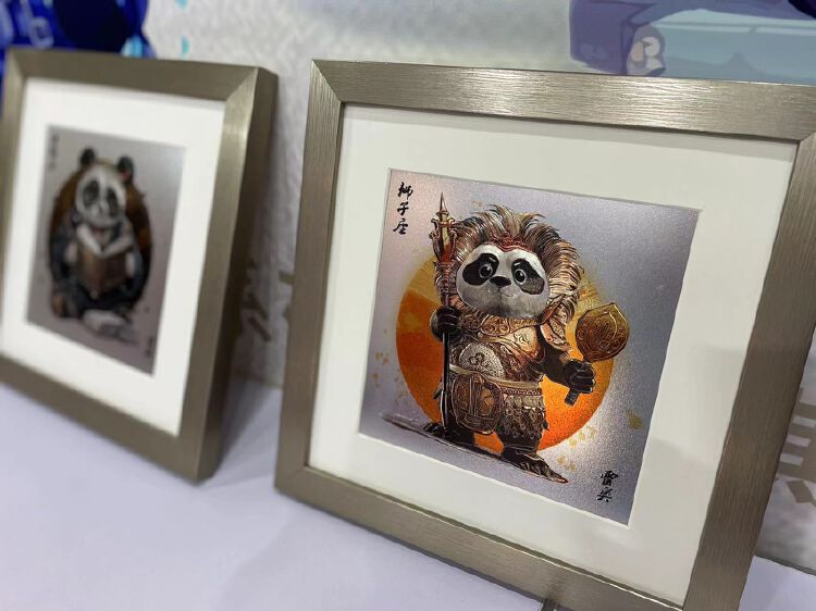 在第十九届文博会14号馆深圳天火数字文化有限公司展位上,一幅“萌帅”的卡通式古代“武士”熊猫金属雕刻画引人注目。这只熊猫身穿着唐代明光铠甲,上面点缀着金色图案和绣花,呈现出中国文化之美。