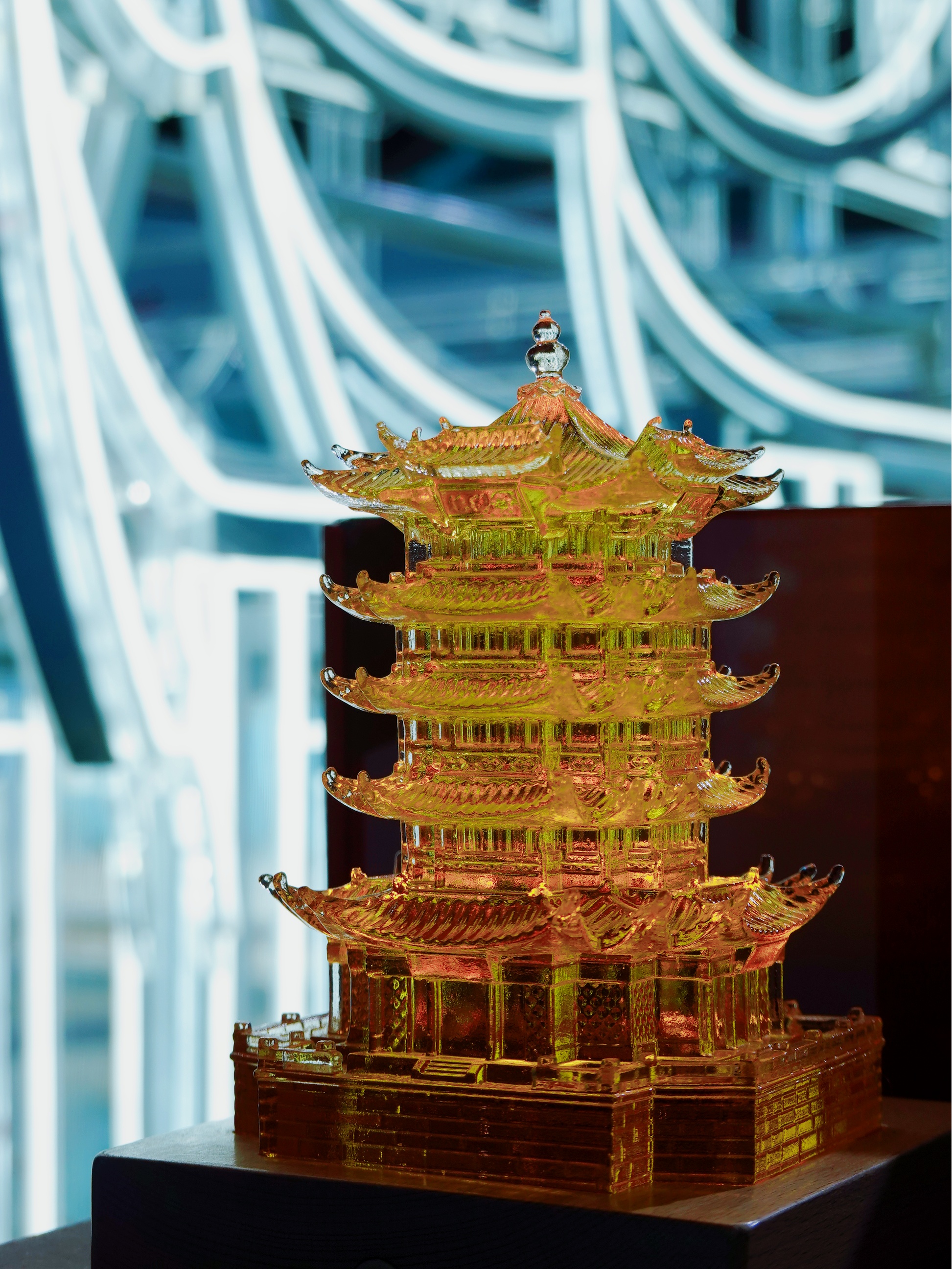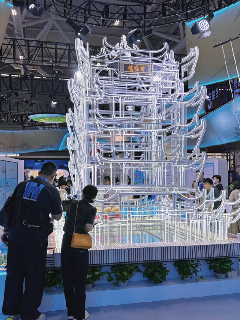 黄鹤楼光雕。武汉地标黄鹤楼,光雕基座部分由《荆楚文库》丛书组成,底座上放着一排可爱的江豚玩偶。