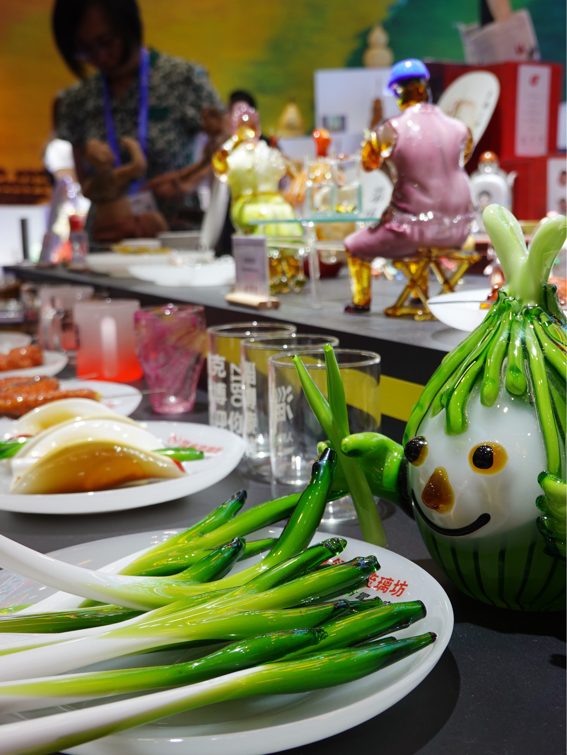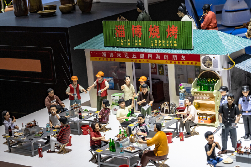 提起山东,不得不说到最近爆火的“淄博烧烤”。手工捏造的软陶和传统淄博琉璃技艺,再现出了“淄博烧烤”场景和各类食材。
