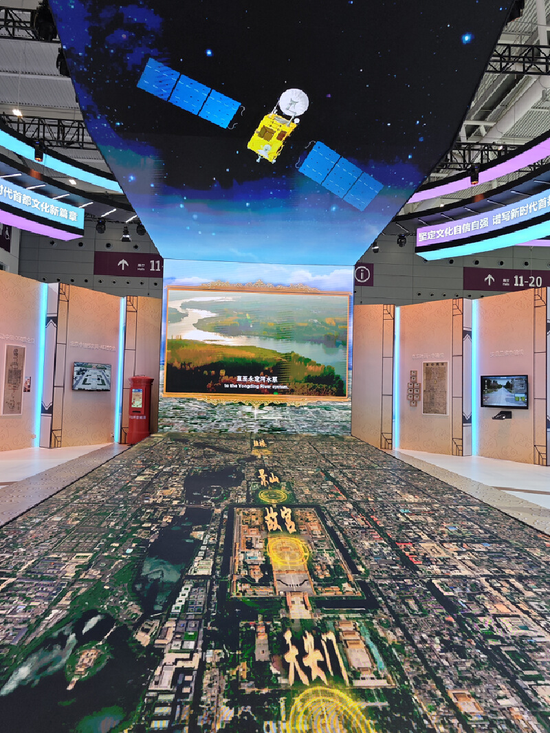 来到北京展馆,眼睛就被一整块“C形”立体屏幕所吸引。屏幕上播放着北京中轴线的高清影像,展示了中轴线的历史变迁。