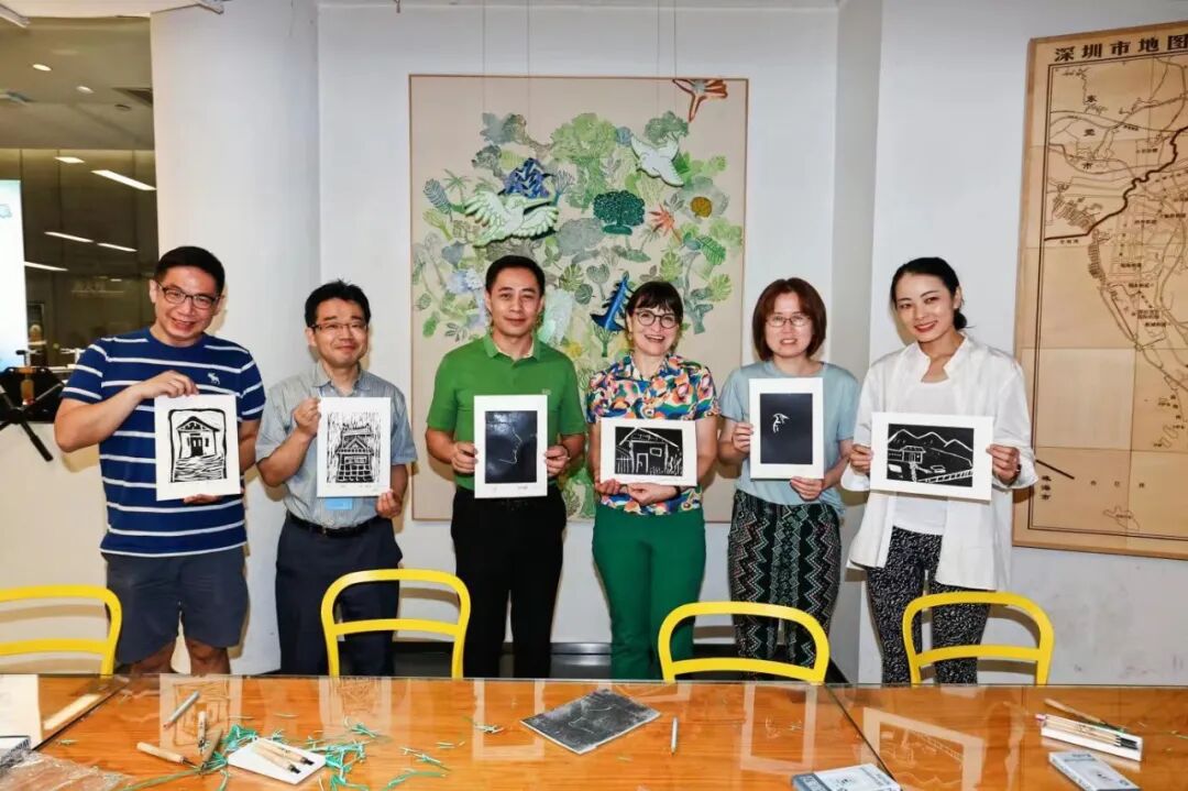 Foreign participants of the exchange camp show their printmaking works during their visit to Guanlan Print Village in Longhua District.