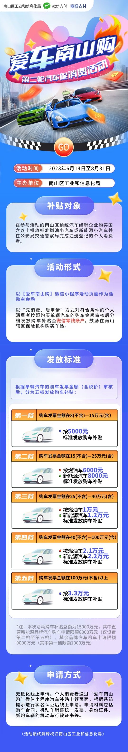 6月14日至8月31日期间,南山区工信局(商务局)联合80余家辖区汽车经销企业,开启第二轮现金购车补贴,个人消费者在参与活动的南山区纳统汽车经销企业处购买小汽车(新车)并在公安局交通警察局完成注册登记的,可根据单辆汽车的购车发票金额(含税价)审核后,分为五档申领5000元—33000元不等的现金补贴。本轮购车补贴总额为1.5亿元,其中直营新能源品牌汽车购车申请限额6000万元(仅设置第二档至第五档)、其余品牌汽车购车申请限额9000万元(其中第一档限额1000万元),按个人消费者资料通过审核时间发放汽车补贴,先到先得,发完即止。如资金提前申请完毕,以申请完毕时间为活动实际结束时间。