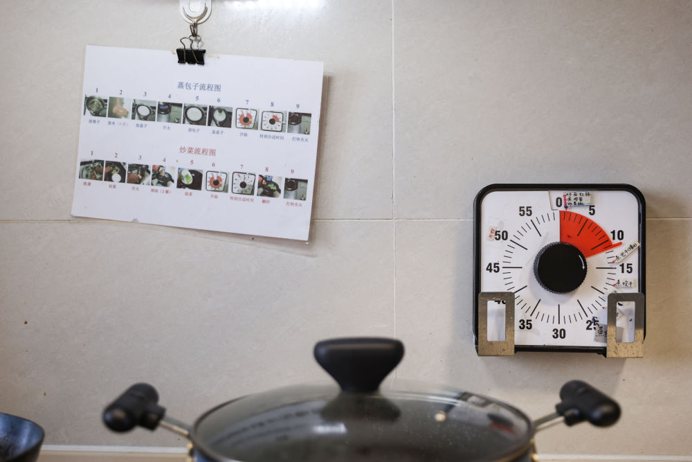 “放垫子、放水5次、放盘子、开火、放包子、盖盖子、开始、转到合适时间、打铃关火。”这是陈勋虎家厨房贴着的一张关于蒸包子的流程图。家里还专门装有一个计时器,并根据实际情况在计时器不同时刻贴有“炒西红柿”“煎鸡蛋”“煮鸡蛋”“蒸玉米”“蒸鱼”等字样的标签,方便儿子旋转到合适的位置。