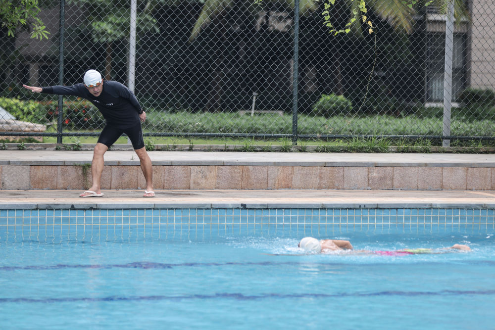 6月12日,陈勋虎在泳池边指导儿子训练。新华社记者 张丽芸 摄