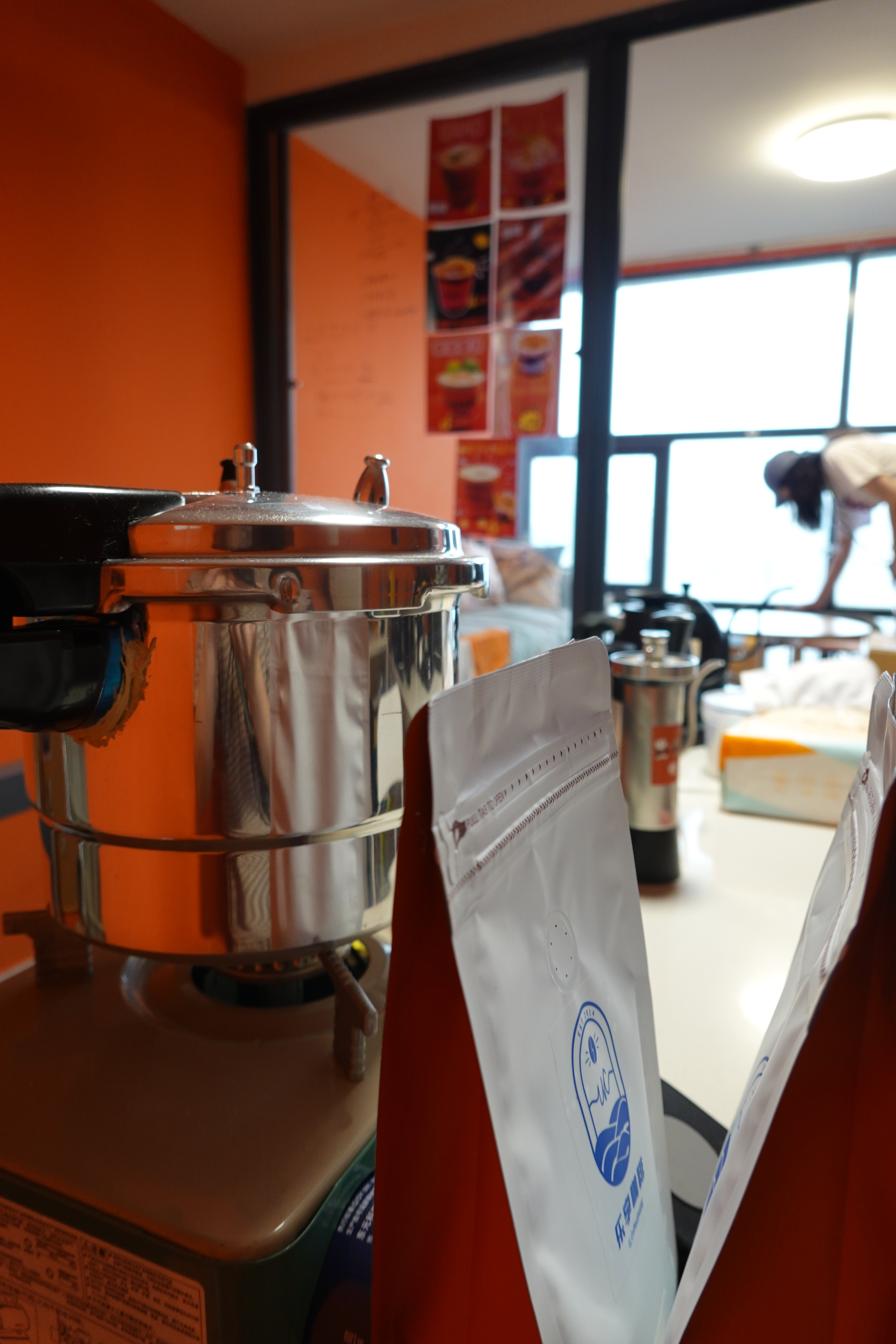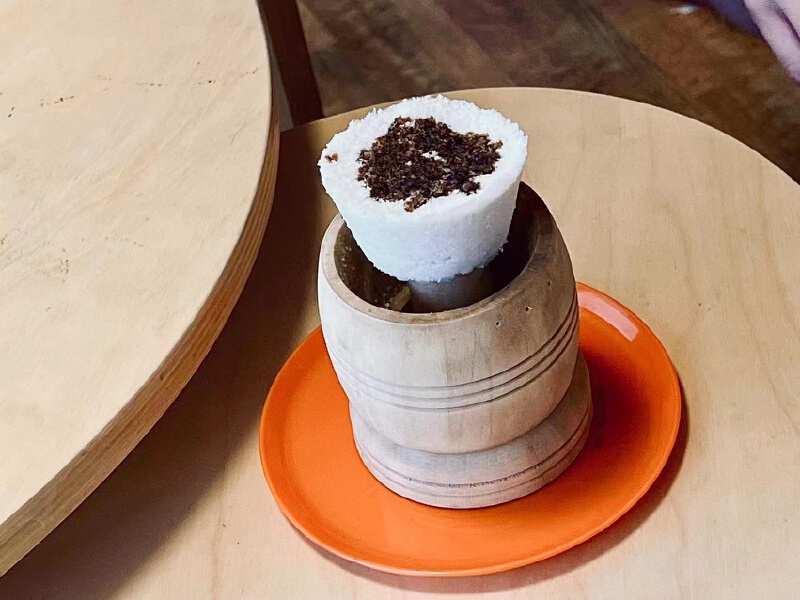 评分最高的那家就是个专门做咖啡的店,老板是湖北人,爱养猫,也爱吃家乡的顶顶糕。他特意买来做顶顶糕的模具,满足自己的故乡味蕾。制作时,往小筒里填上米粉,面上撒红糖,蒸熟后从底部用木杵顶出来,形如小蘑菇的松软米糕就蹦出来啦。老板说,因为现代人对控糖执著得可怕,他还对顶顶糕的配方做了无糖改良版。