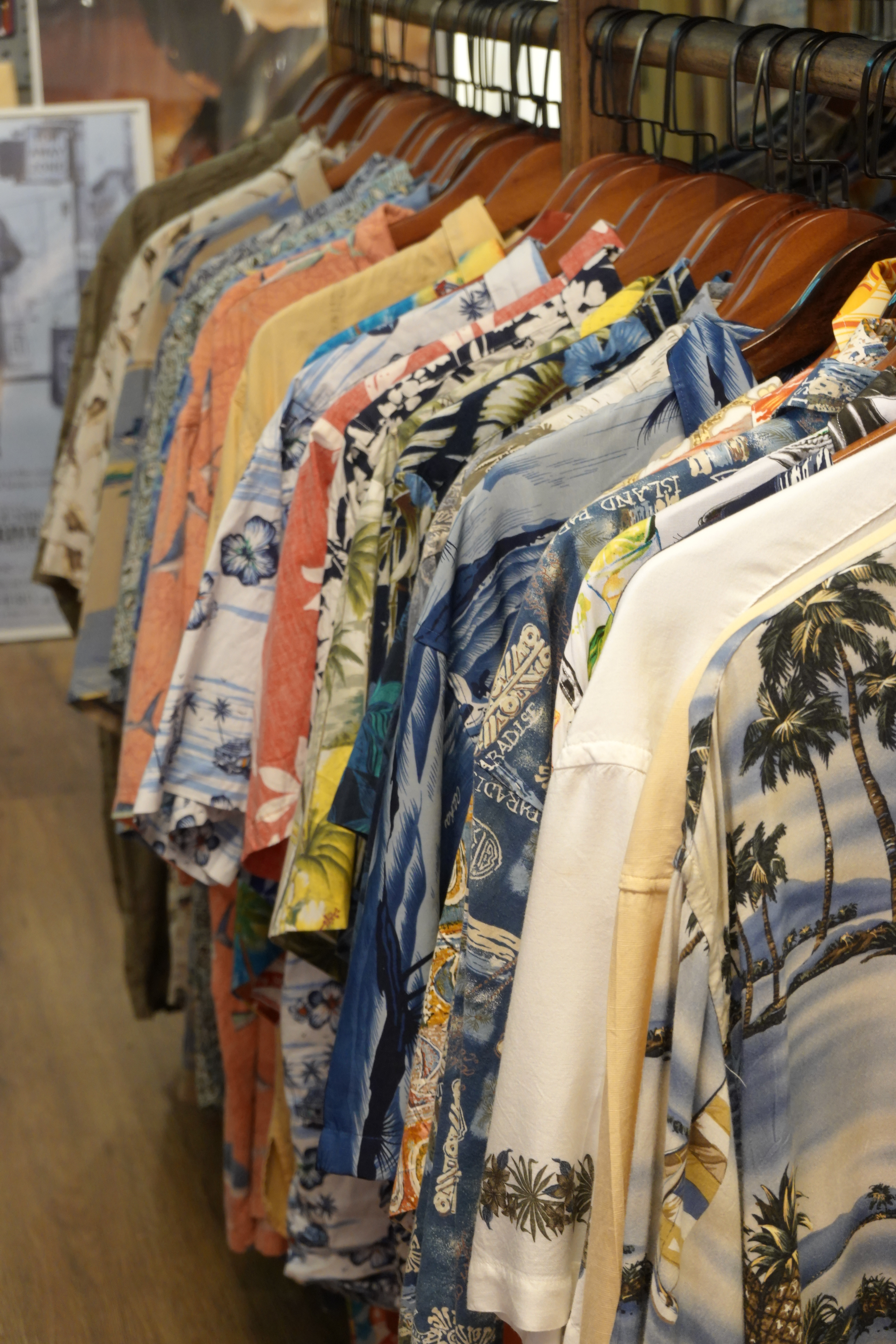屋内的C位留给了几排挂满服装的货架,这些衣服风格也很统一,清一色的花哨图案,走的是街头潮流风,以花衬衣和工装、牛仔裤为主,搭配售卖少量的帽子、领带、项链等配饰。其中有好几件衣服,格外眼熟,仔细想了下,大概就是老港片中常见的样式吧。
