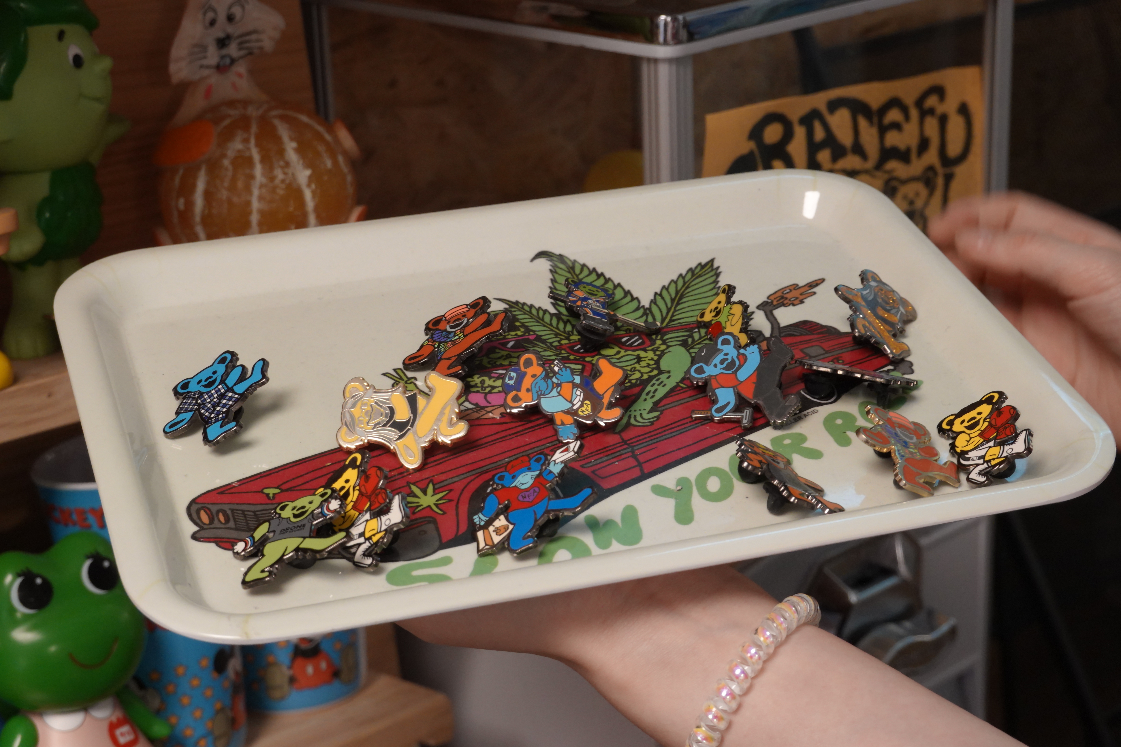 其中最火的一家店,深深地藏在楼道的尽头。穿过灯光晦暗的长廊,推开窄窄的玻璃门后,眼睛瞬间就被里面丰富的色彩点亮。大门右手边就是几幅颇具年代感的动漫海报,再往里走,视线会不自觉被琳琅满目的小玩具所吸引,各种造型和材质的手办、胸针、公仔等摆满了靠墙的几个展柜,没有十足的克制力,真的很难忍住不上手把玩一番。