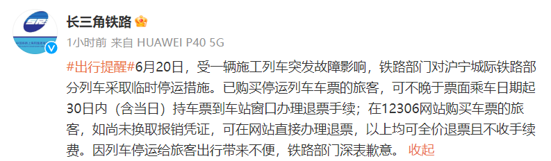6月20日,长三角铁路微博发布消息称,受一辆施工列车突发故障影响,铁路部门对沪宁城际铁路部分列车采取临时停运措施。已购买停运列车车票的旅客,可不晚于票面乘车日期起30日内(含当日)持车票到车站窗口办理退票手续;在12306网站购买车票的旅客,如尚未换取报销凭证,可在网站直接办理退票,以上均可全价退票且不收手续费。因列车停运给旅客出行带来不便,铁路部门深表歉意。