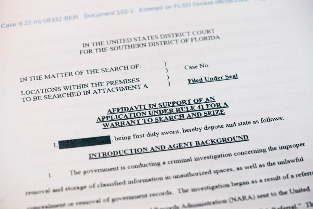 这是2022年8月26日拍摄的美国联邦调查局申请搜查前总统特朗普住所海湖庄园时向法院提交书面证词的部分内容。新华社记者刘杰摄