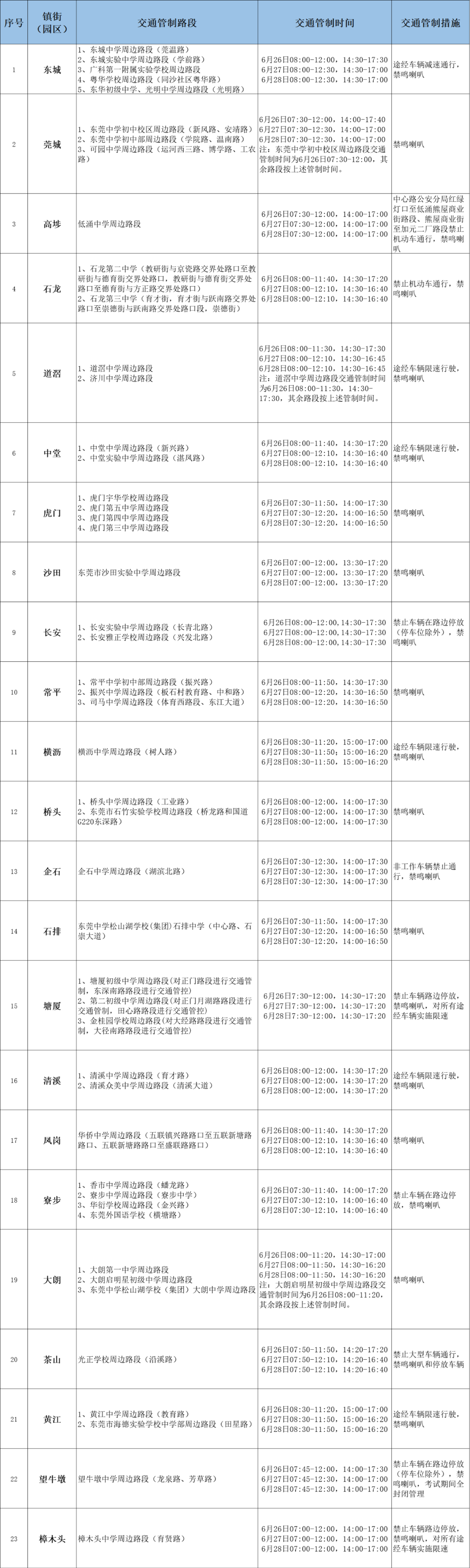 2023年东莞市初中学业水平考试将于6月26日至28日举行,为确保考试期间辖区道路交通秩序良好,给考生提供一个安静、良好的考试环境。届时,东莞交警将对考点周边路段实施临时交通管制,详情如下。