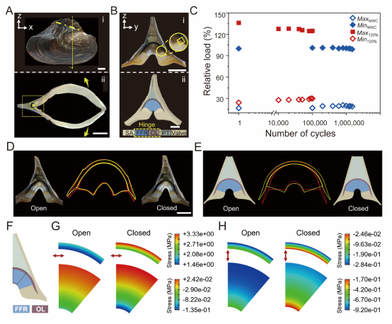 记者从中国科学技术大学获悉,该校俞书宏院士团队联合吴恒安教授团队成功揭示双壳纲褶纹冠蚌铰链内的可变形生物矿物硬组织的耐疲劳机制,提出了一种多尺度结构设计与成分固有特性相结合的耐疲劳设计新策略,为未来耐疲劳结构材料的合理设计和制备提供了新的见解。相关研究成果日前发表在国际学术期刊《科学》上。