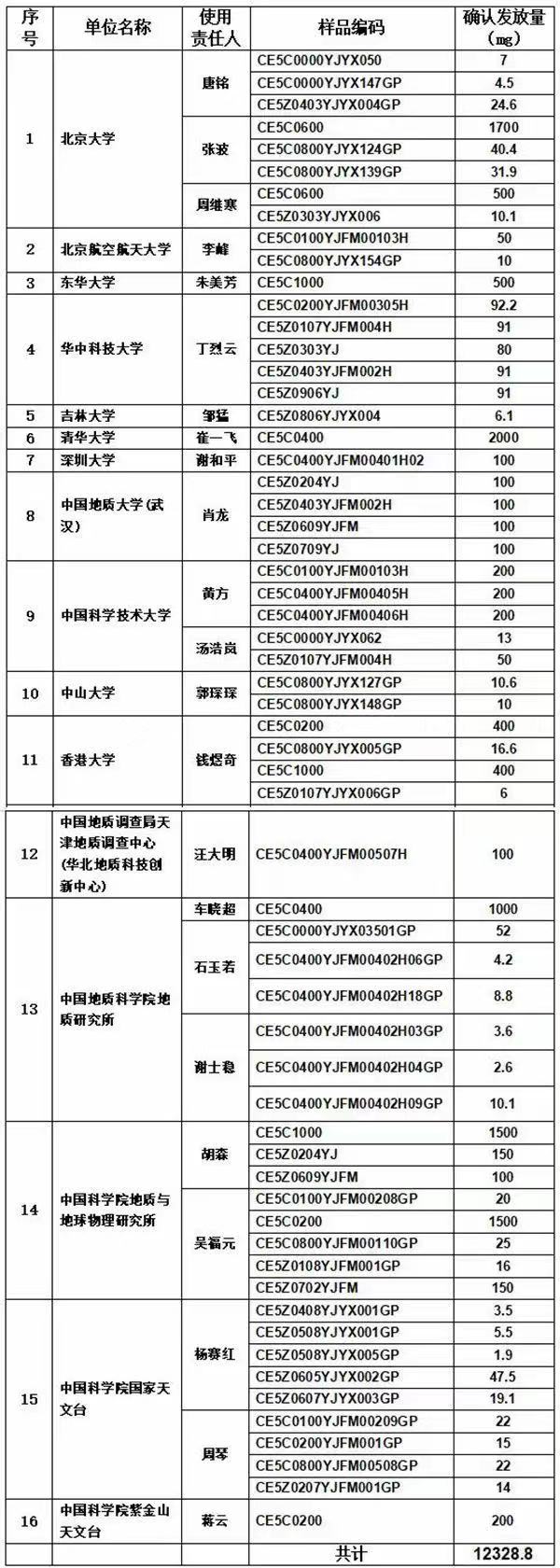 来自月球的“土特产”,深圳大学有了。6月26日晚,探月与航天工程中心发布了《关于发放第六批月球科研样品的公告》。该公告显示,2023年5月,探月与航天工程中心(月球样品管理办公室)在北京组织召开了第六次月球科研样品借用申请评审会。经专家委员会评审,探月与航天工程中心审核,最终16家科研机构的60份申请获得通过,对应23名使用责任人,样品发放量共计12328.8毫克。其中,深圳大学(使用责任人谢和平)获得一份样品,确认发放量为100毫克。