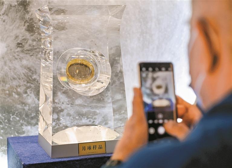 ▲游客在中国航天博物馆参观展出的月球样品。 新华社发