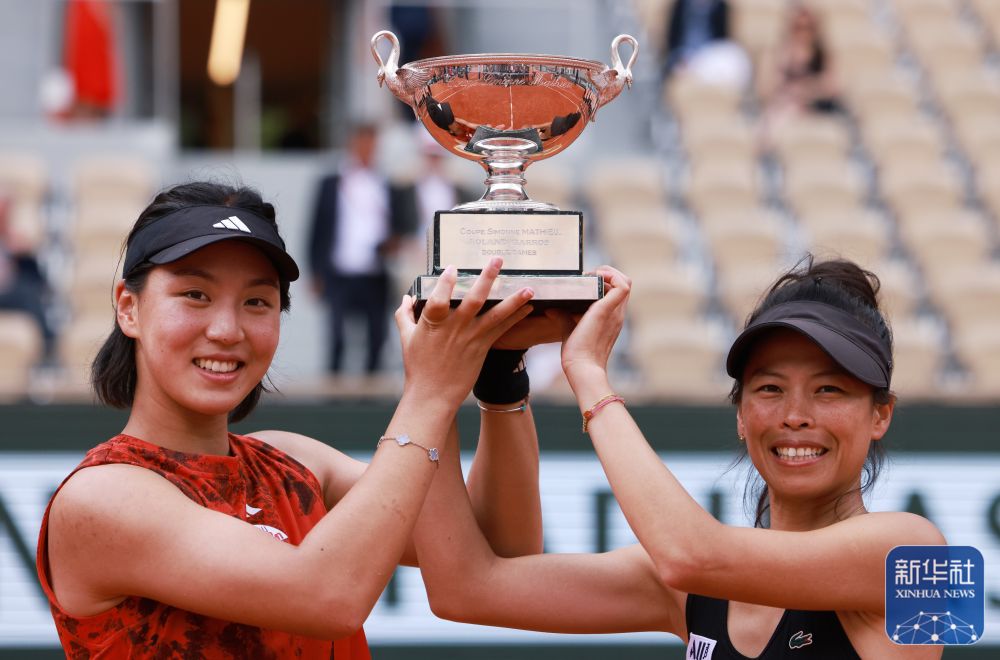 王欣瑜(左)/谢淑薇捧起女双冠军奖杯“西蒙娜·马蒂厄杯”。图源:新华社
