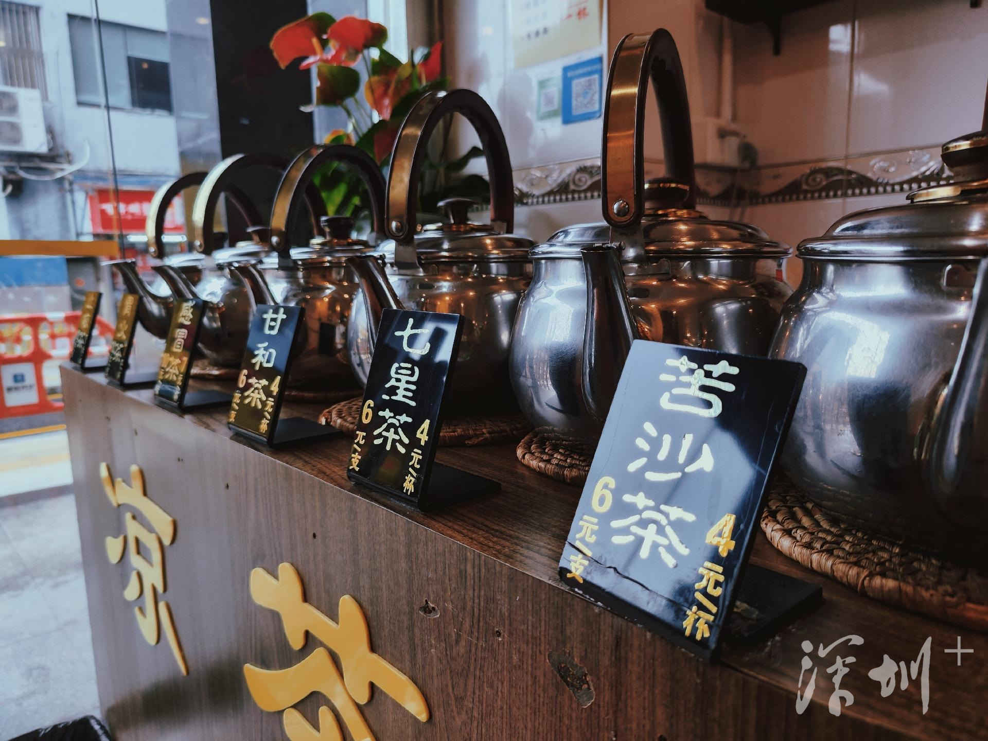 推开门便被门口几个装着凉茶的大茶壶吸引,熟悉的“甘和茶”“苦沙茶”“七星茶”等几款凉茶让广东人的“凉茶DNA”动了,总想喝上一杯凉茶降降火。