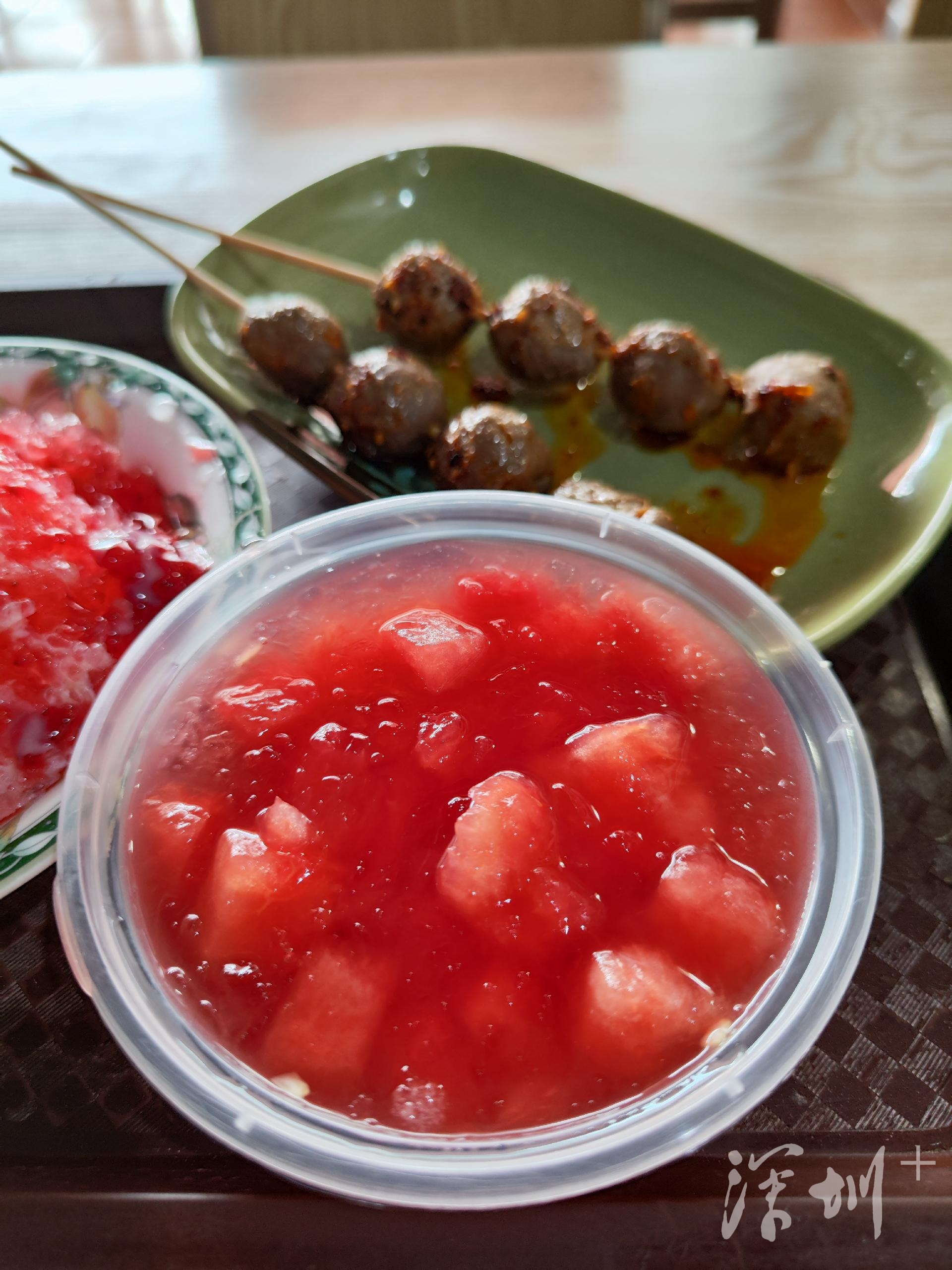 夏季的明星,当属西瓜冰——拌着西瓜块和冰沙的西瓜水。刚被送上餐盘时的硬冰渣嘎嘣脆,若怕硌牙,也可以等它在西瓜水里多软化一下。此外,店里的猪红、炸串,也是桌桌见的热门菜品。