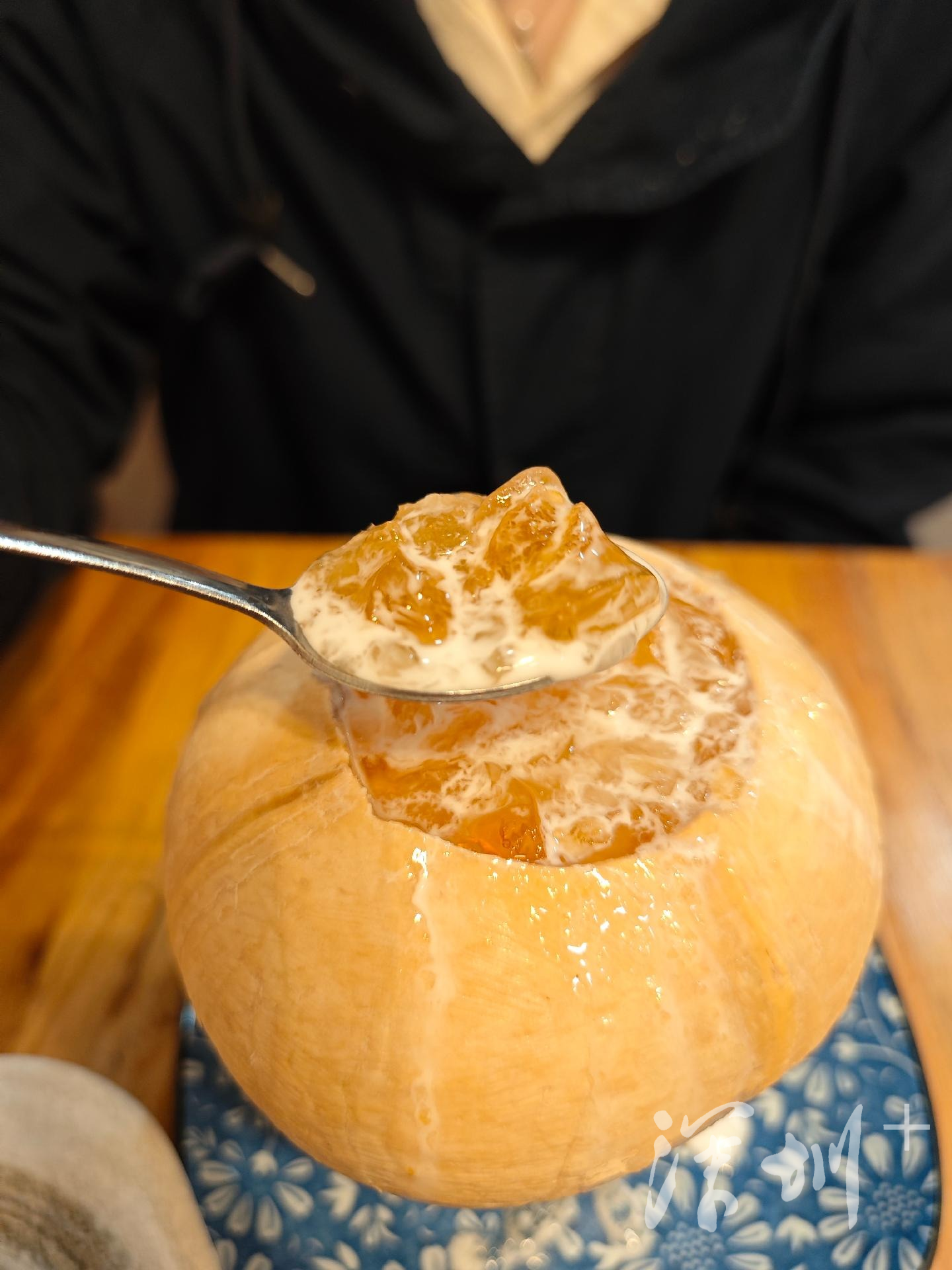 招牌糖水——桃胶椰皇冻,是用一整个椰子做成的,最上面是满满晶莹剔透的桃胶,泡在椰奶里飘出淡淡椰香,端上来时,满到溢出的椰奶沿着椰子壳流下。