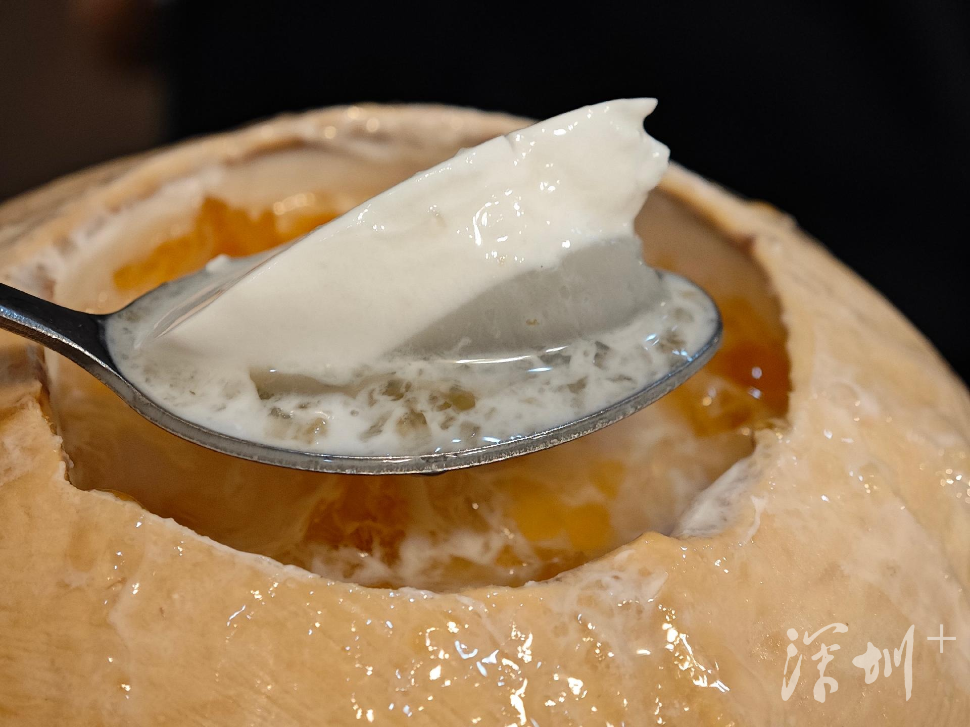 一勺挖下去是藏在桃胶下的椰冻,椰冻入口冰凉爽滑,口感Q弹,清甜中带着浓浓椰香味,吃完意犹未尽还能挖椰子肉吃。