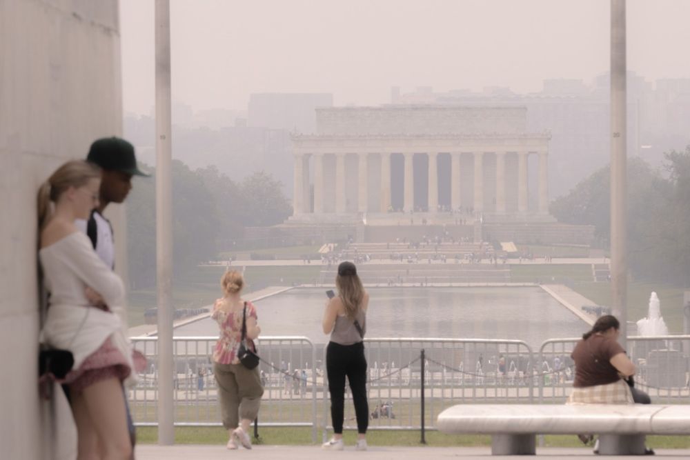 6月29日,在美国首都华盛顿,游客在华盛顿纪念碑游览,远处的林肯纪念堂笼罩在烟雾中。新华社发(亚伦摄)