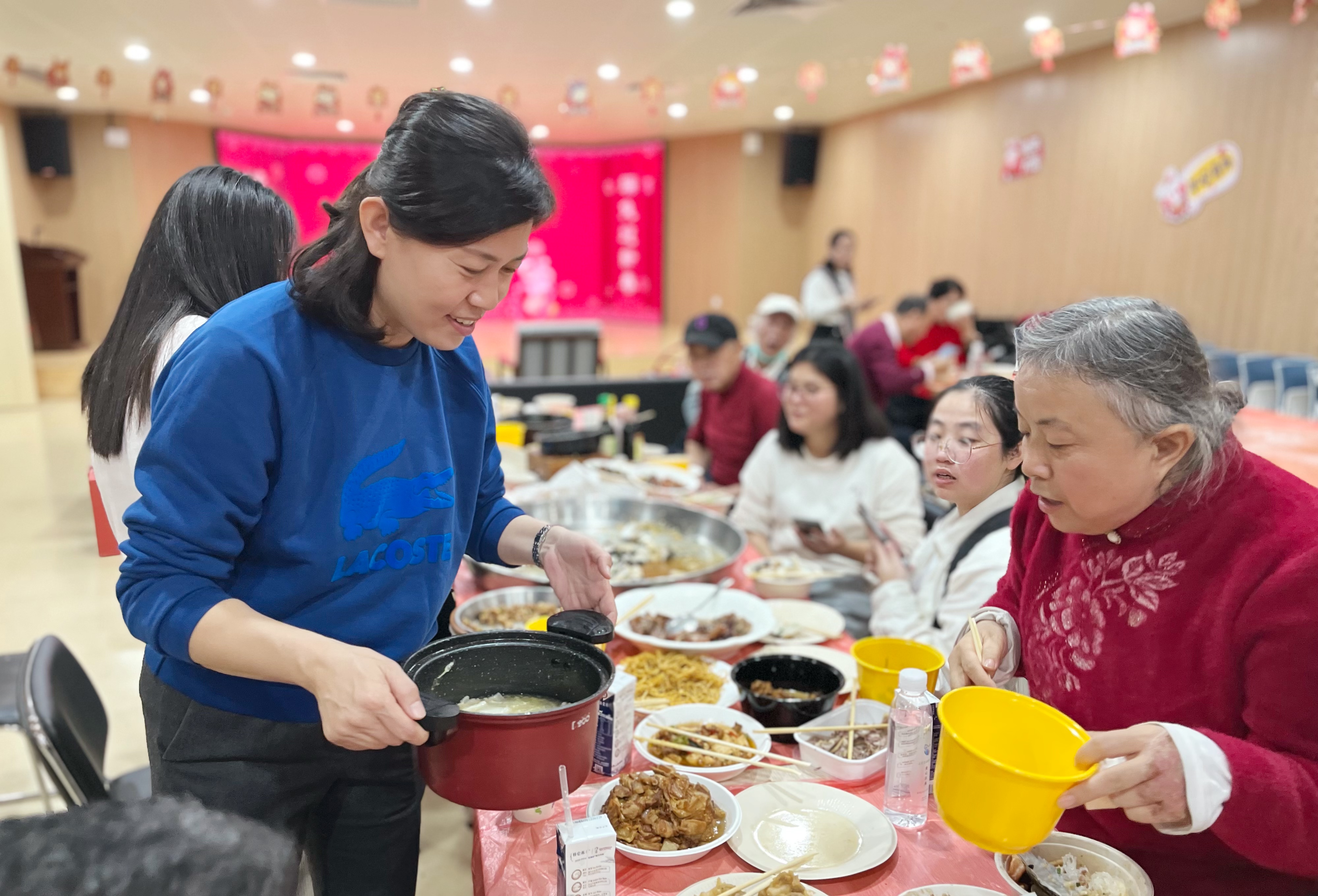 ▲今年除夕,在民治街道北站社区党群服务中心,社区党委书记郑阳与辖区独居老人一起吃年夜饭。受访单位供图。