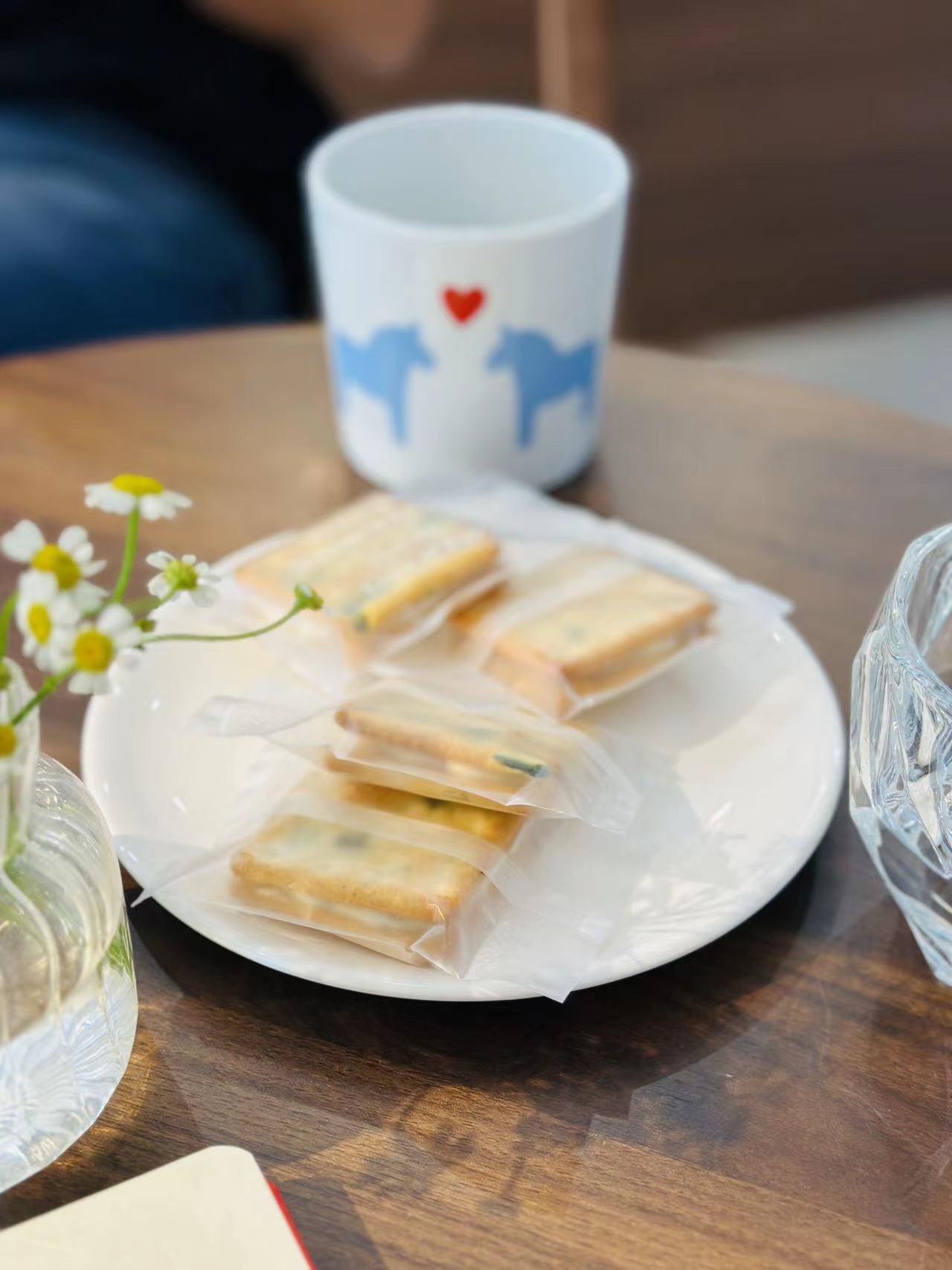 一进门,店内布置淡雅简约,不大的空间,却规划得十分整齐。暖白色的灯光,柜子上鳞次栉比的咖啡豆,墙面上摆放着各类书籍,桌面上一束束洋甘菊让甜品店显得格外清新,感觉时间在此也慢了下来,流淌的似乎是生活中的种种诗意。