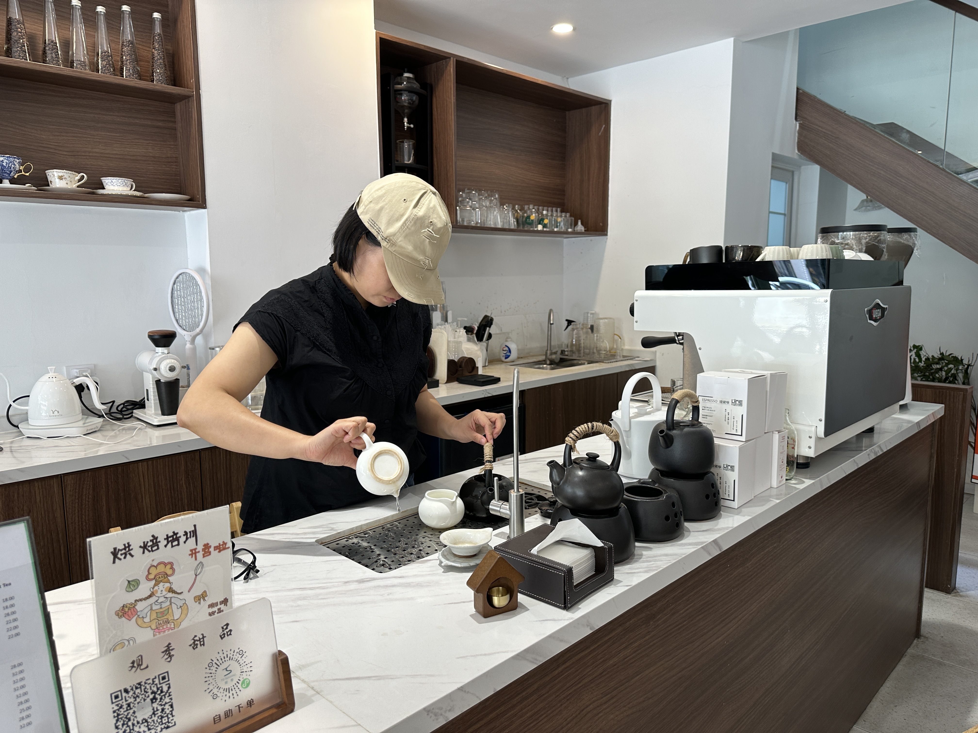 ▲观季甜品咖啡主理人岳丽娟正在为顾客调制饮品。