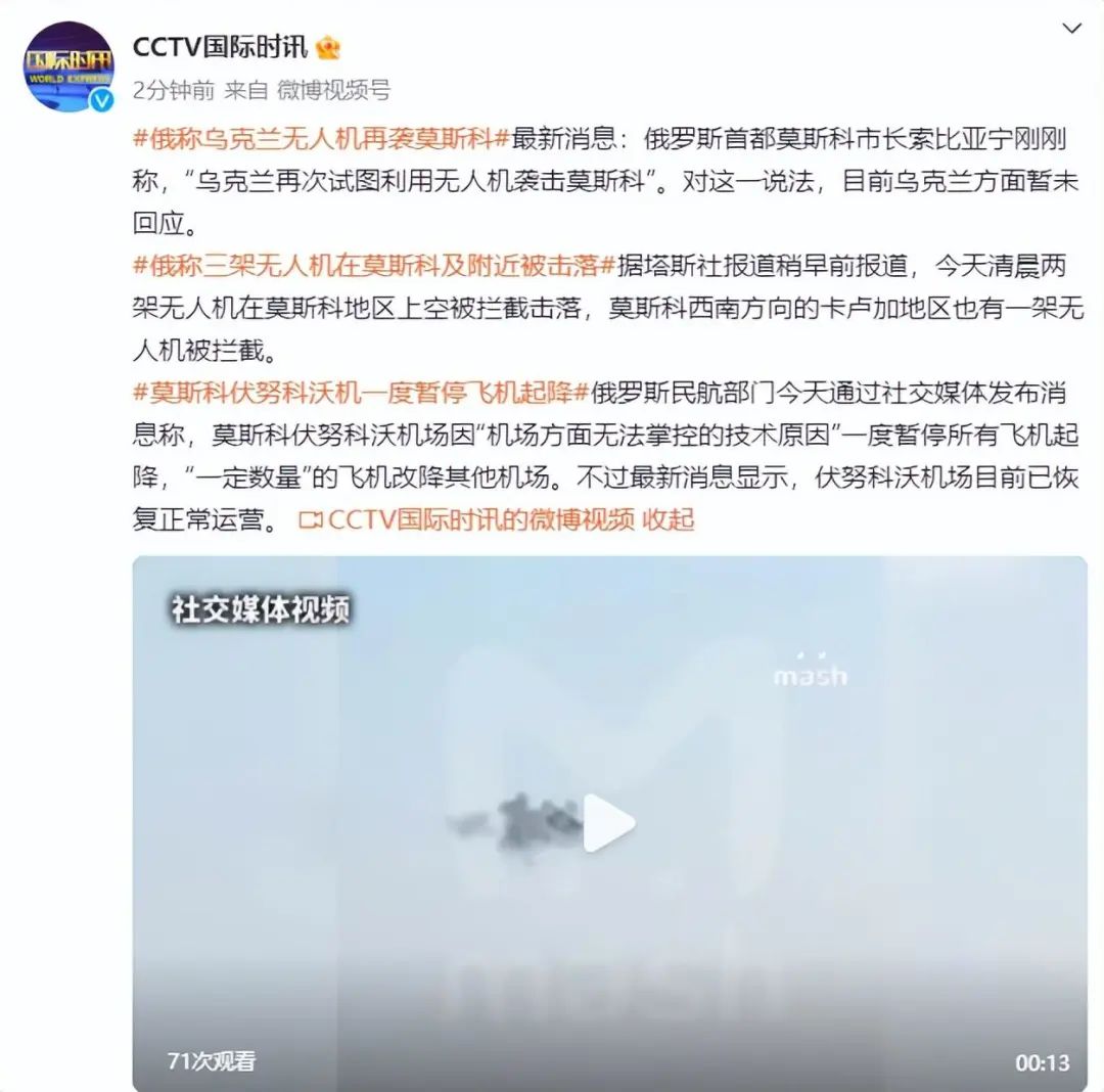 (原标题《俄称乌克兰无人机再袭莫斯科》)