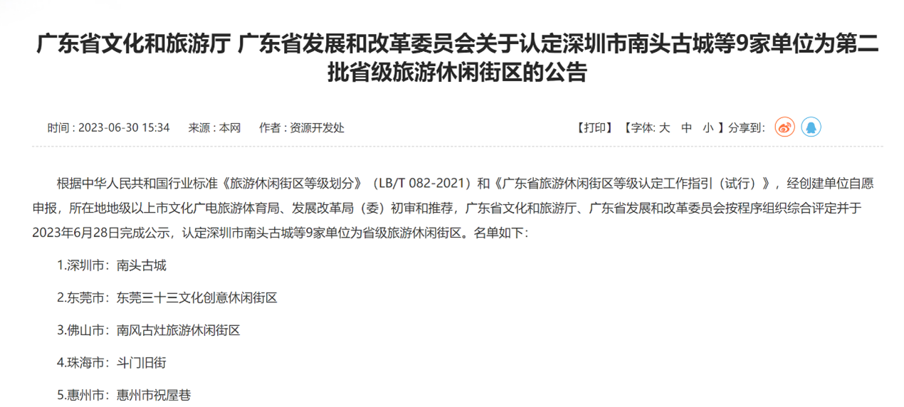 近日,广东省文化和旅游厅、广东省发展和改革委员会发布《关于认定深圳市南头古城等9家单位为第二批省级旅游休闲街区的公告》,经过公示,南头古城和大鹏所城双双被认定为省级旅游休闲街区。